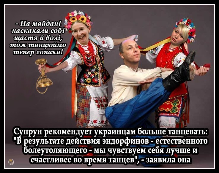 Исполняющая обязанности главы Минздрава Украины Ульяна Супрун предложила украинцам лечиться танцами. По ее мнению, гопак помогает улучшить физическую активность и социальные навыки. Об этом и. о.министра написала на своей странице в Facebook.